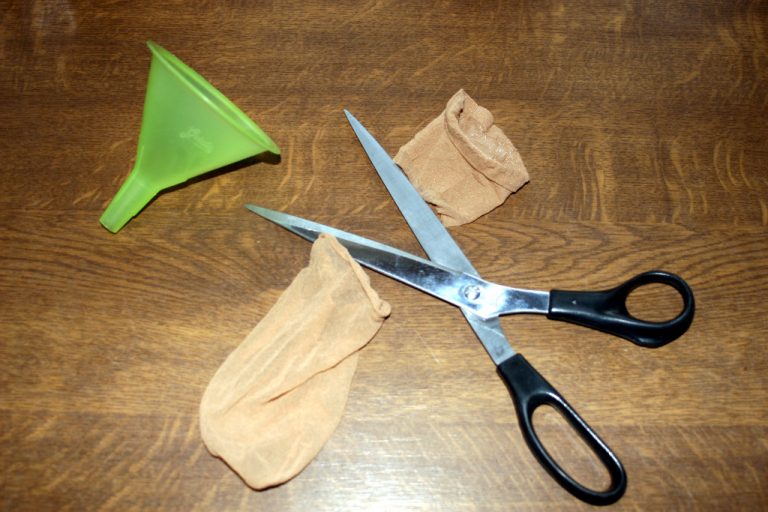Dann habe ich wieder meinen Trichter genommen und das Extrakt durch eine Feinstrumpfhose vorgefiltert.