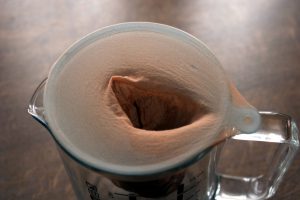 Aufgrund der Tipps von Fonzis habe ich mich entschieden mit 10% Rohmaterial zu arbeiten. Das hat sich auch als sinnvoll herausgestellt, denn bei 20% entsteht ein Brei und das gemahlene Popcorn ist eher nur pampig, schwimmt aber nicht im Lösungsmittel.
